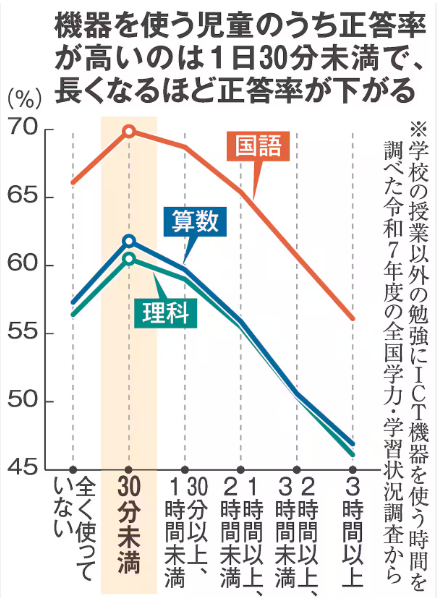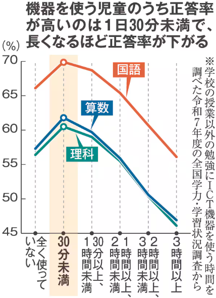 少し前になりますが、産経新聞のニュースサイトに「国期待のデジタル教科書 先進国で進むアナログ回帰 子供の学力低下への懸念背景に」という記事(令和7年度全国学力・学習状況調査の結果に基づくもの)が掲載されていました。以下のグラフはその記事からの転載です。