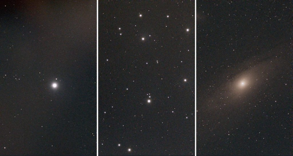 左から「しし座α星」、「スバル」、「アンドロメダ銀河」