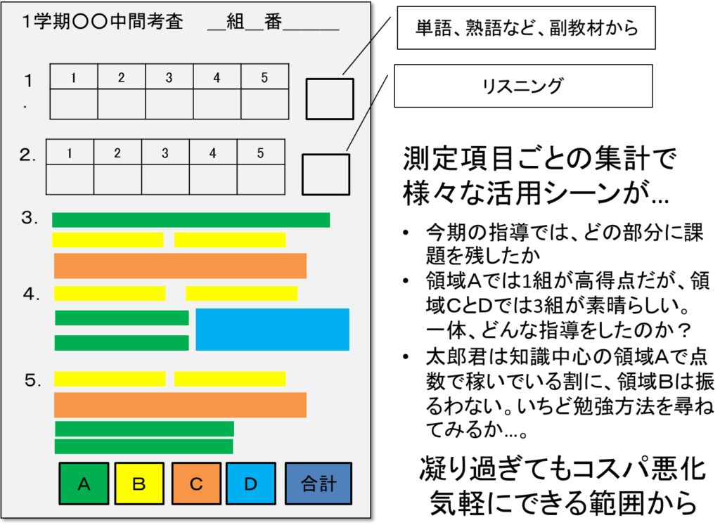 また、先生方が「考査の結果から自分の授業を振り返る」にしても、総合点だけを判断材料にしては、指導改善に向けた課題形成もピントのぼけたものになります。