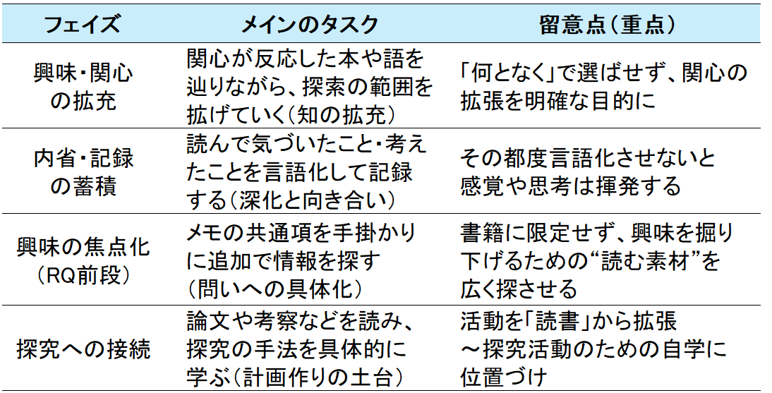探究活動のテーマを見つけたり、その前段階としての興味・関心の拡充というのであれば、相応の目的と方法を備えた「朝読書」を設計しなければならないはずです。フェイズを分けて考えていきましょう。