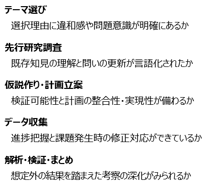 探究活動の指導に”評価”を実装 探究活動において「評価」を行うことの重要性は、別稿「探究のフェイズごとにきちんと評価&フィードバック」で書いた通りです。探究活動は、フェイズが進むと前工程に戻ることが難しい構造のため、教科学習指導以上に「各フェイズでの着実な評価実施」が不可欠です。評価を行うためには、評価の基準(観点別に整理した段階的な評価規準=ルーブリック)に加えて、評価の機会が不可欠。探究活動では、成果物以上に、プロセスに焦点… 2026年4月9日 続きを読む